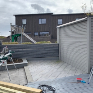 Gjenbruk: Gammel tre-terrasse supplert med nytt helle-gulv og overbygg