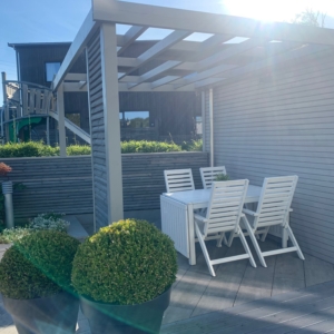 Vedlikehold handler også om å ta varer på møbler og annet året rundt. Planlegg for en år-syklus, med oppbevaring, for eksempel under et overbygg hvor møbler, parasoll og annet kan lagres under trekk.